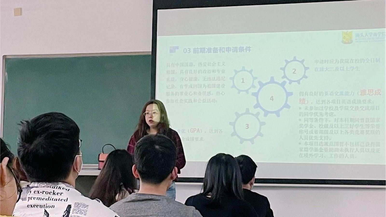 许老师通过讲解项目的申请条件,鼓励同学们应积极备考雅思,好好学习提高学业成绩,才能抓住学院国际化办学的机遇,在大学四年期间争取到出国交流的机会。最后,面对同学们的各种疑问,许老师耐心且详细地一对一解答,使得同学们对出国交流有了更深刻且详尽的理解。