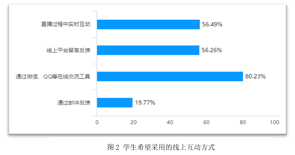 教师在线教学形式是否契合学生需求?我们通过对学生的调查发现,74.03%的学生希望教学形式包含直播,63.39%的学生希望教师采用“直播+录播”的方式进行线上教学。而在线上学习过程中,80.23%的学生最希望与教师“通过微信、QQ等在线交流工具进行互动”。这说明教师选择的教学形式与学生需求比较契合。