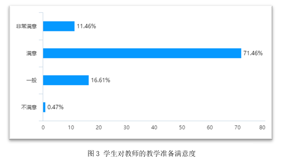 调查结果显示,学生对金沙官网线上教学总体满意。对于老师的教学准备满意度方面,选择非常满意和满意的占82.92%,表示不满意的仅0.47%。