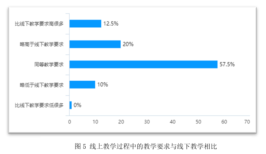 线上教学过程中的教学要求与线下教学相比,57.5%的老师表示同等要求, 32.5%的教师选择比线下要求高。这体现了金沙官网教师在特殊时期以新形式开展教学,仍然秉持高标准严要求的责任态度。