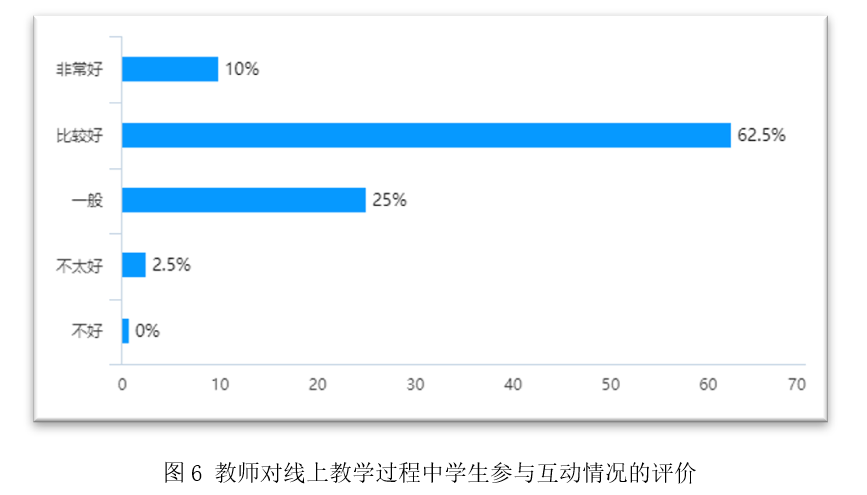 对于线上教学过程中学生参与互动的情况,选择非常好和比较好的教师分别占10%和62.5%,认为不太好的仅占2.5%。