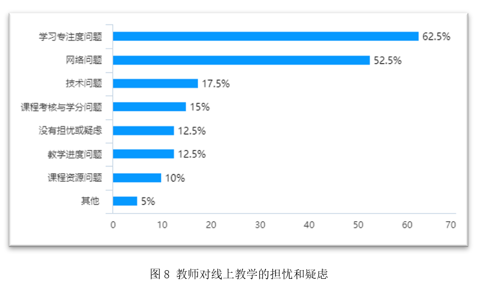 教师方面,62.5%的教师对在线教学感到有一定压力但能够克服,25%的教师认为压力不大,10%的教师表示没有压力。而教师对线上教学的担忧或疑虑最多的主要是学习专注度问题、网络问题和技术问题。