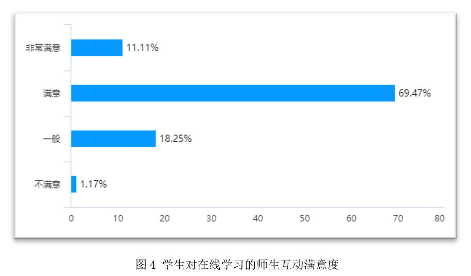 对在线学习中的师生互动总体情况,学生的满意度也较高,选择非常满意和满意的占80.58%,表示不满意的仅1.17%。