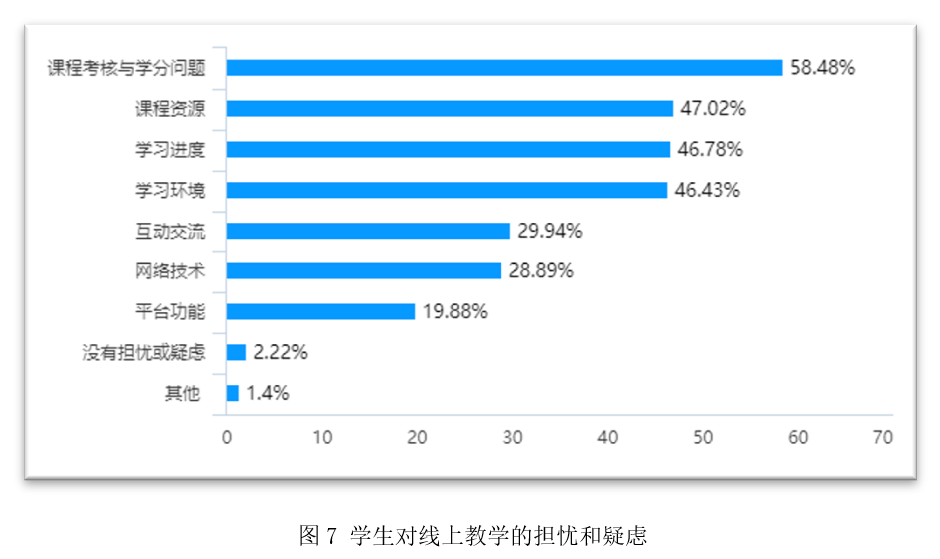 调查显示,66%的学生对在线学习感到有一定压力但能够克服,22%的学生表示压力不大,9%的学生表示有很大压力,对开展学习感到困难。而学生对线上教学的担忧或疑虑最多的从高到低依次是课程考核与学分问题、课程资源、学习进度和学习环境。